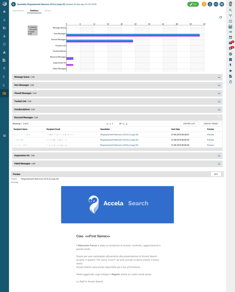 Prepare your Targets on vtenext (they will be synchronized as TAGs in your Mailchimp list), plan your campaigns on Mailchimp, and all the data will then be imported and stored in your CRM.